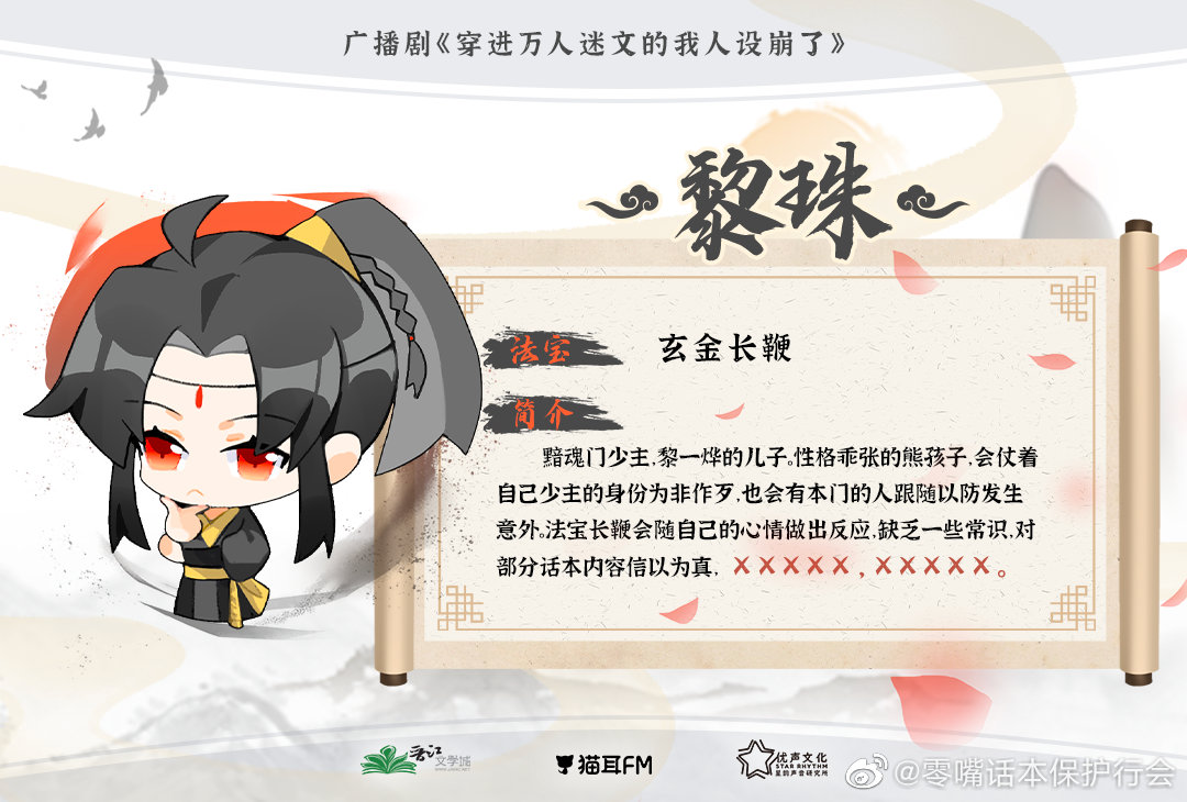 https://weibo.com/7719637441/L4d3OvqFQ 오디오드라마 <천진만인미문적아인설붕료> ☁️려주☁️ 법보 현금장편* 간단 소개 암혼문의 소주이자, 려일엽의 아들. 성격 괴팍한 문제아.자신의 소주란 신분을