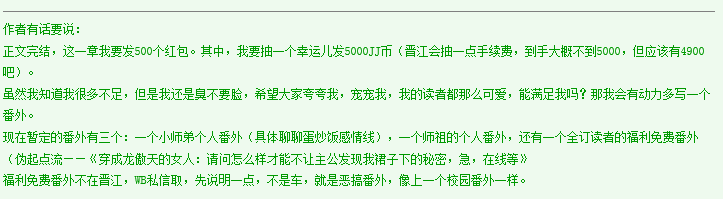 현재 잠정한 번외는 세 가지 있습니다 : 하나는 소사제 개인 번외 (구체적으로 단초반의 감정선을 다룸), 하나는 사조 개인 번외, 다른 하나는 전편 구매 독자 서비스 무료 번외 (비정통 기점중문망 스타일 - < 먼치킨 주인공의 여자로 빙의해버렸다 : 저기요 어떡하면 주인공이 내 치마 아래의 비밀을 알지 못하게 할 수 있을까요? 급함, 기다리고 있어요>